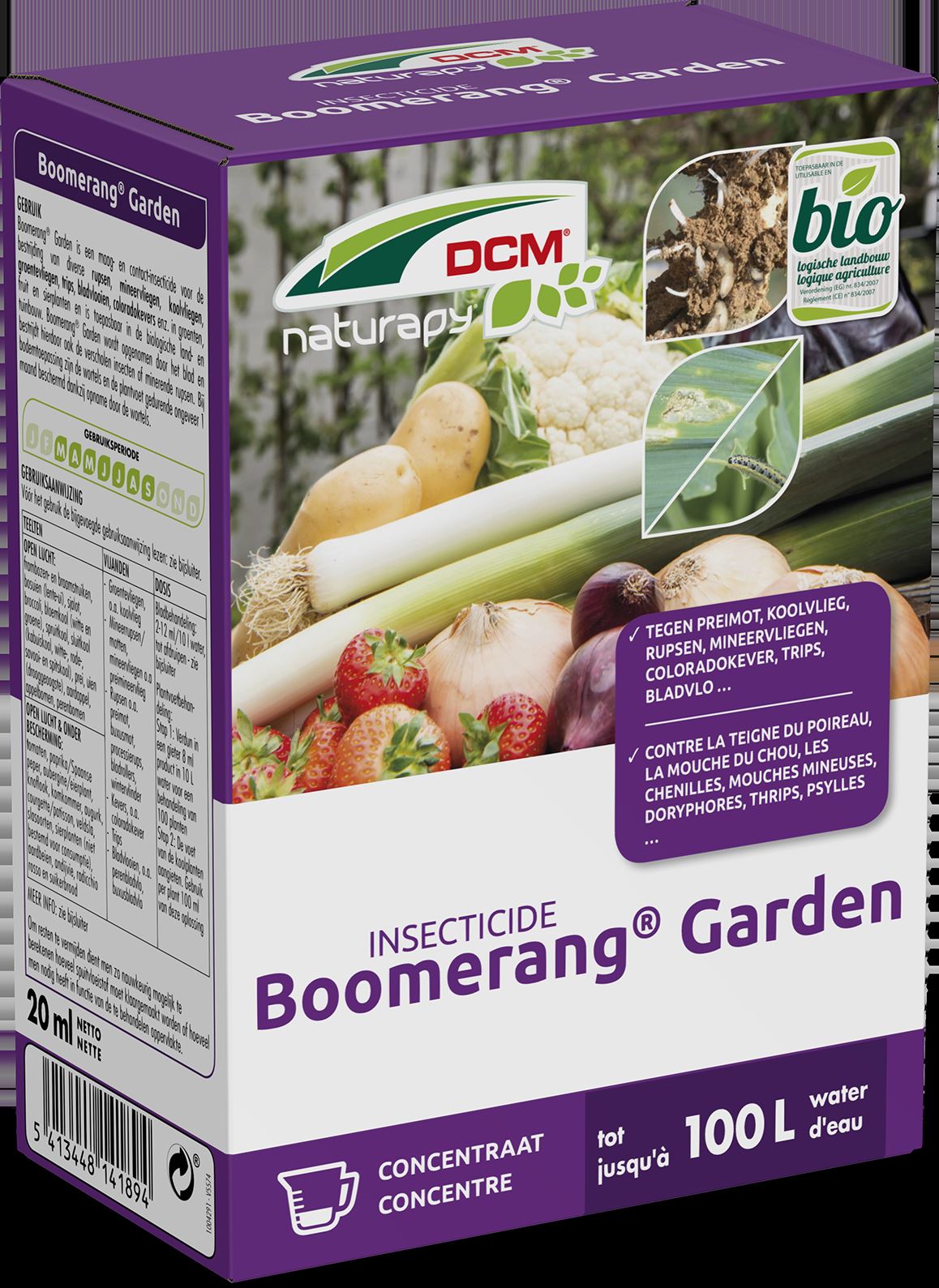 Insecticide de contact et d’ingestion pour la lutte contre la teigne du poireau, la mouche du chou, les chenilles, les mouches mineuses, les doryphores, les thrips, les psylles, etc. en cultures maraîchères et fruitières. Boomerang® Garden est absorbé par le feuillage et élimine grâce à cela également les insectes cachés ou les chenilles mineuses. Appliqué sur le sol, il protège les racines et le pied de la plante contre les mouches du chou pendant environ 1 mois, grâce l’absorption par les racines. Il est utilisable en jardinage biologique.