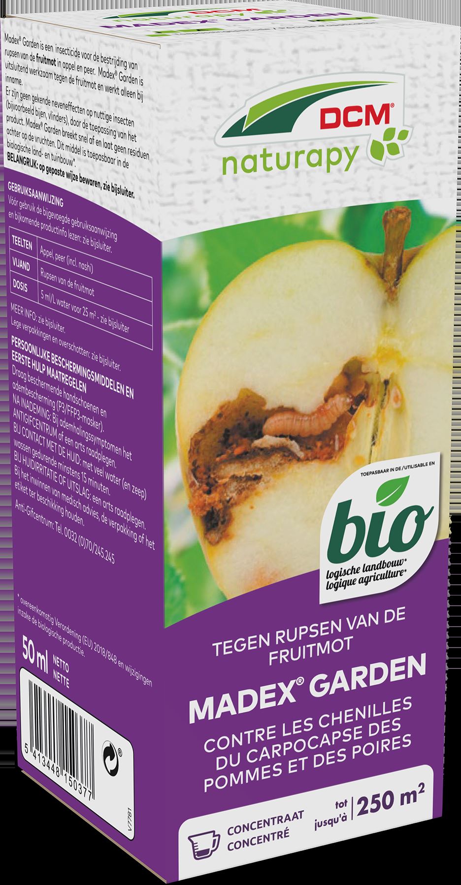 Commandez avec cet emballage 50 ml de Madex® Garden, un insecticide contenant un agent pathogène naturellement présent dans l’environnement et spécifique du carpocapse des pommes et des poires : le virus de la granulose du carpocapse des pommes et des poires. Madex® Garden n’est efficace que contre le carpocapse des pommes et des poires. L'application du produit n'a pas d'effets secondaires connus sur les insectes utiles. Utilisable en jardinage biologique.
