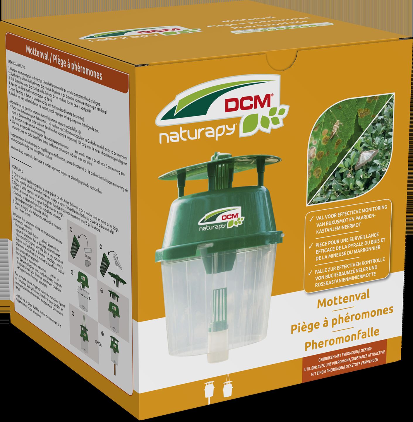 Le Piège à phéromones DCM est à utiliser en combinaison avec la phéromone DCM adéquate. Ce piège unique a été spécialement conçu pour capturer quelques insectes parasites spécifiques, tels que la pyrale du buis ou la mineuse du marronnier, afin de les surveiller. Ce piège est facile et rapide à monter. Robuste et résistant aux intempéries, il peut être utilisé pendant plusieurs années.